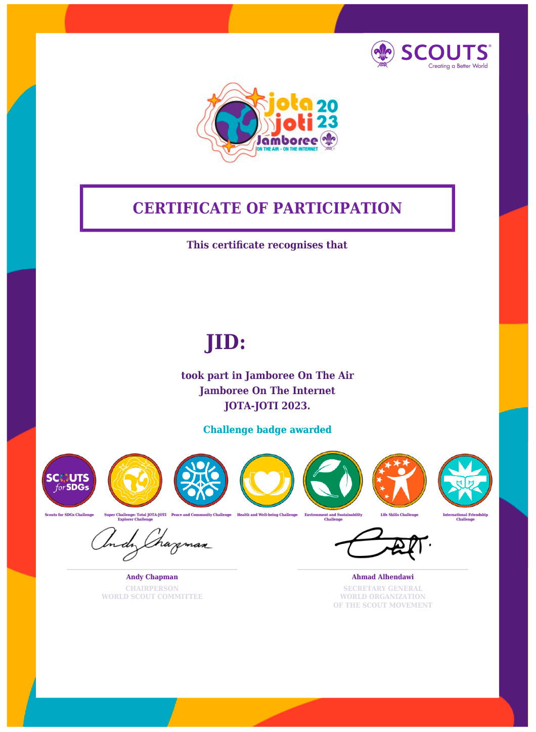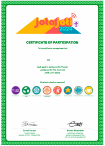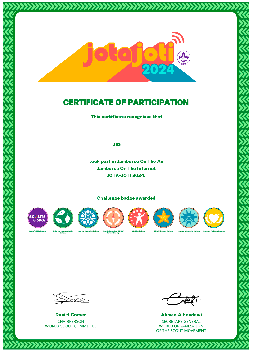 Estes cartões contém o logótipo do JOTA do respectivo ano e uma caixa em branco onde o participante poderia escrever seu nome, com “Took Part” impresso abaixo da caixa. Nos últimos anos este passou a ser enviado de forma digital para quem se inscreve no Jota Joti através da pagina oficial do Bureau Mundial.